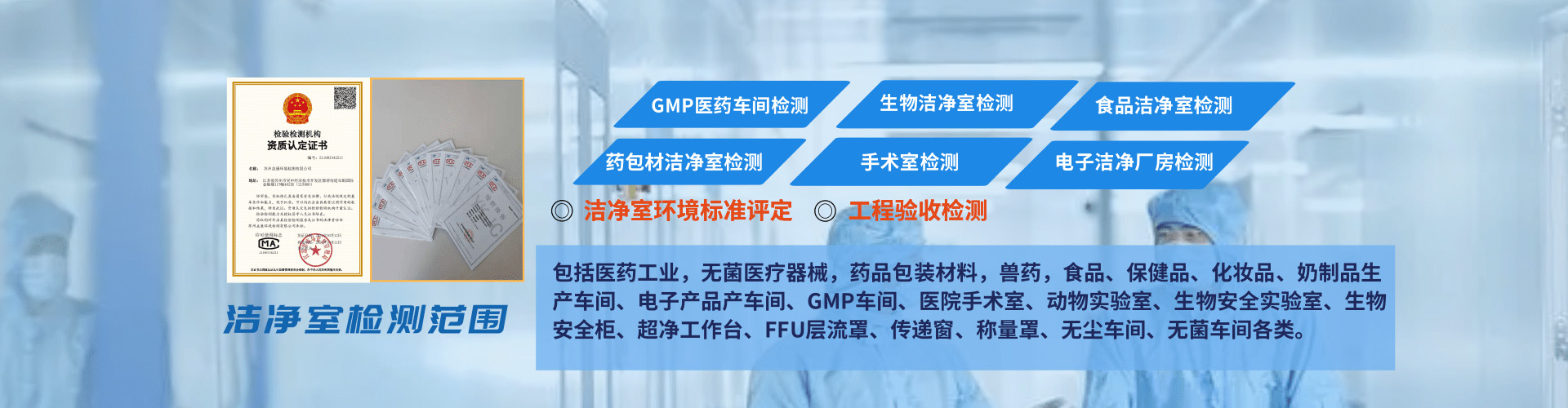 主營業(yè)務(wù):凈化車間檢測(cè) 三方潔凈室檢測(cè) 計(jì)算機(jī)化系統(tǒng)驗(yàn)證 潔凈室檢測(cè) gsp溫濕度驗(yàn)證 高效過濾器檢測(cè) 壓縮空氣檢測(cè)  純化水檢測(cè) 潔凈度檢測(cè)